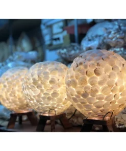 Hình Dáng : đèn có hình tròn được ghép lại bằng nhiều vỏ sò, đặt trên đế gỗ.