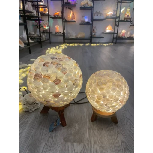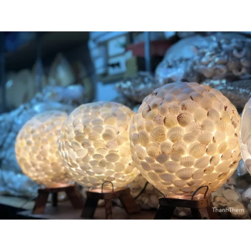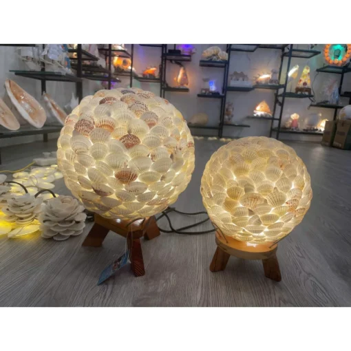 Hình Dáng : đèn có hình tròn được ghép lại bằng nhiều vỏ sò, đặt trên đế gỗ.